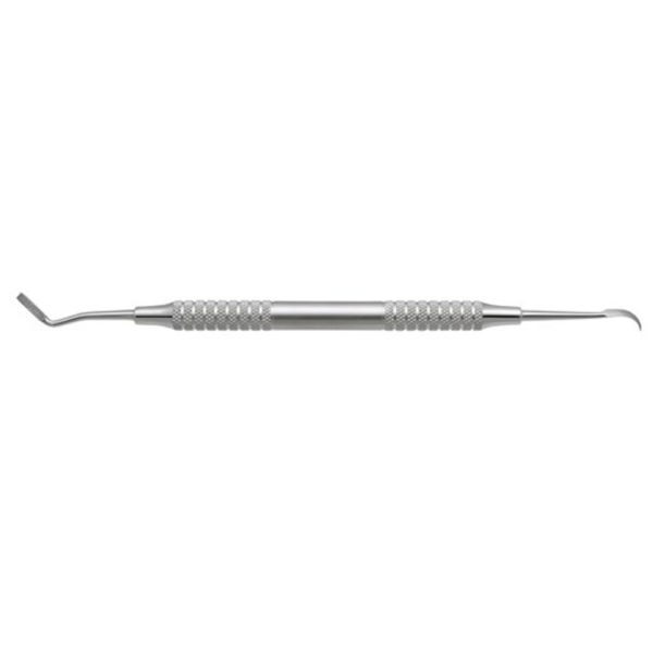 The band seater has a serrated tip for contouring and seating of bands. The other end is a scaler to aid in removing excess cement.